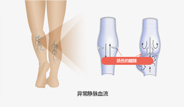 如果血液向心脏方向的小腿肌肉和防止血液逆流的静脉内瓣膜(valve)功能不全而血液出现逆流的话,静脉内的压力增加,导致血管膨胀和扩张。